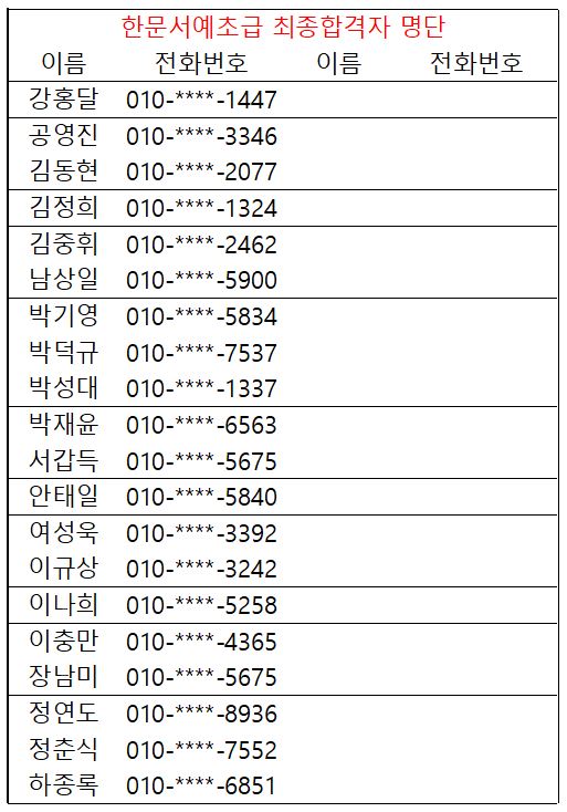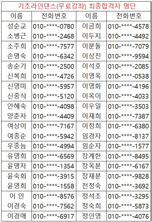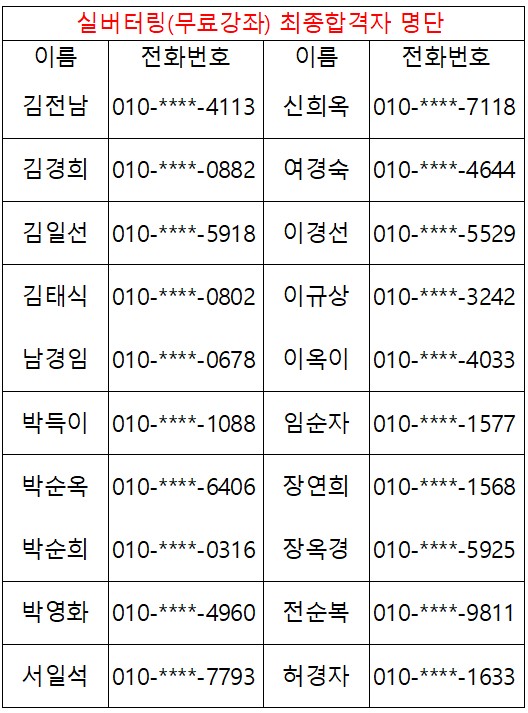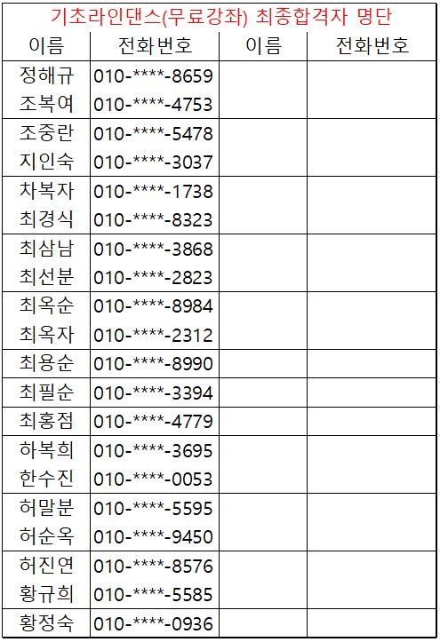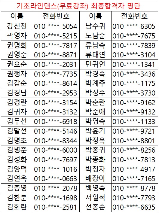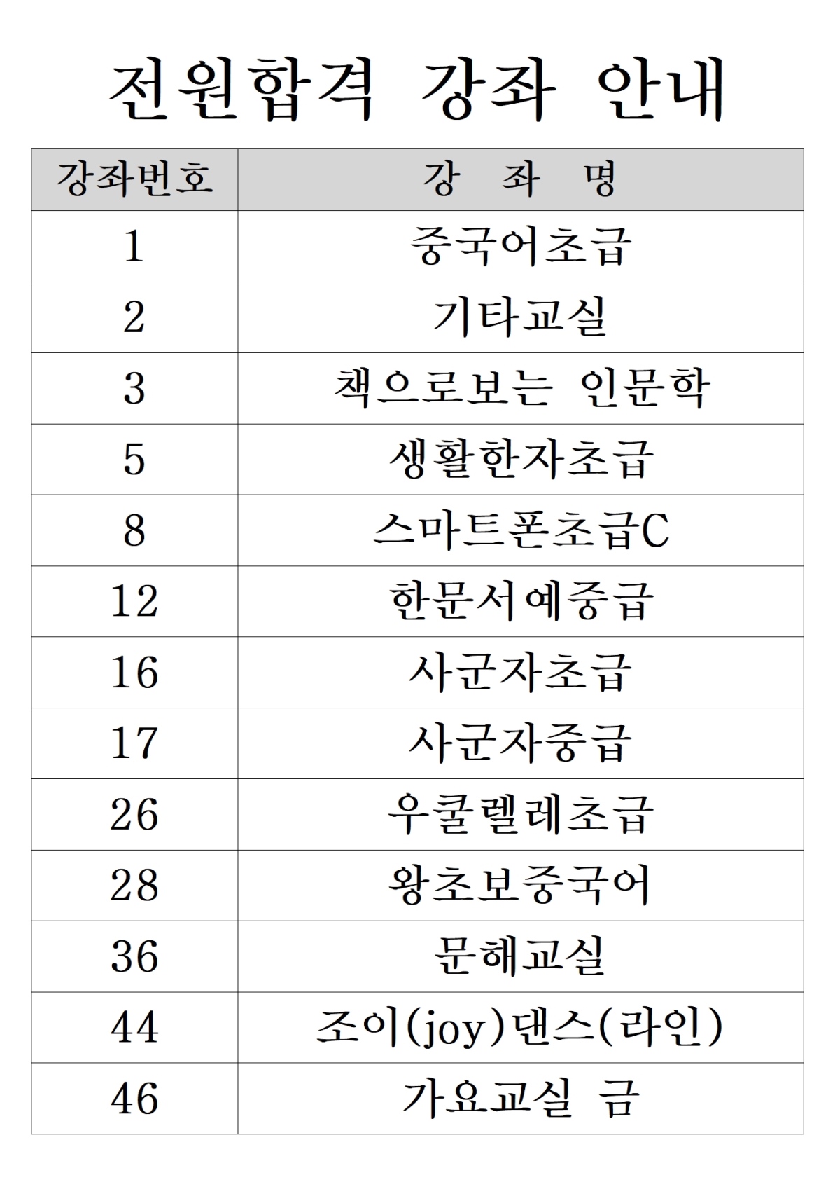 * 2026년도 상반기 평생교육 및 노인대학 미달강좌 추가모집 안내 * - 생활한자초급 - 스마트폰초급C - 사군자초급 - 사군자중급 - 문해교실 - 조이(joy)댄스(라인) - 가요교실 금 ◎ 강좌별 후보 순위가 궁금하신 분께서는 사무실로 연락주시면 간단한 본인확인 후 안내해드리도록 하겠습니다. |
