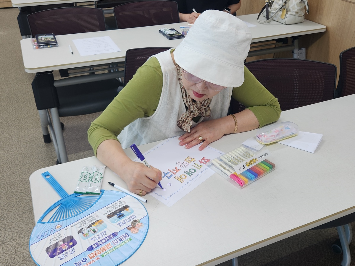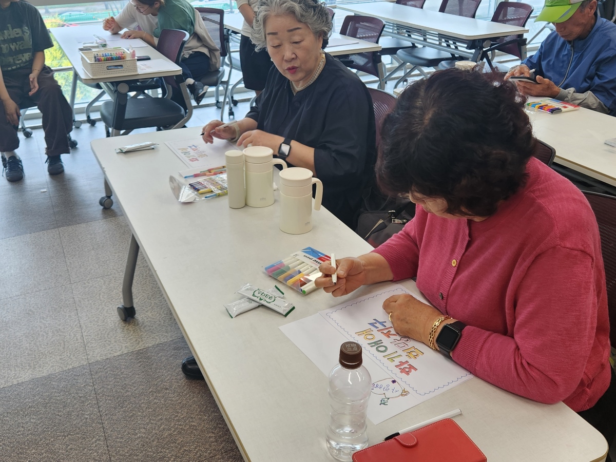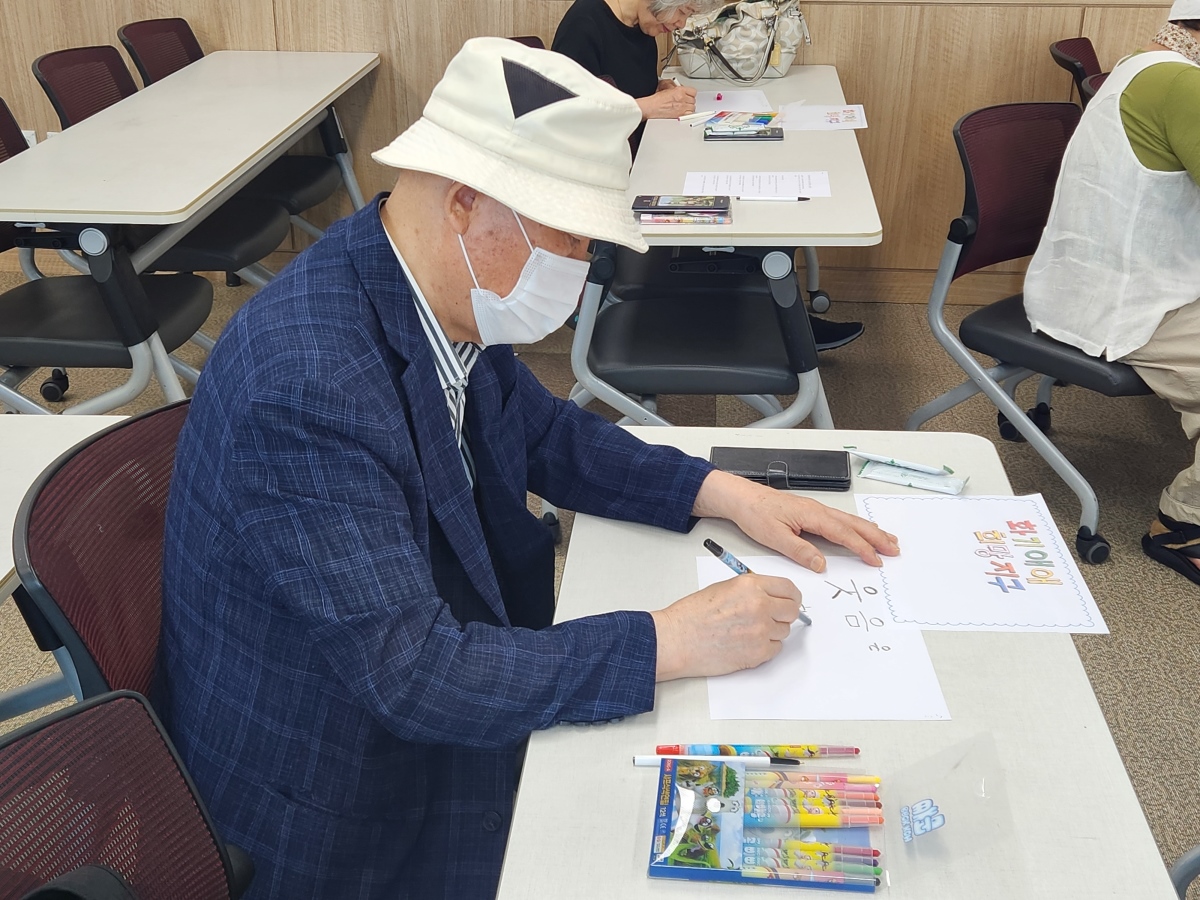오늘은 [화기애애 희망지구]의 마지막 시간이라 다 같이 롤링페이퍼를 만들며 함께한 시간을 떠올리는 시간을 가졌습니다. 롤링페이퍼에 프로그램에 참여하며 느꼈던 점을 적어보고, 앞에서 소감을 발표하며 마무리하였습니다. [화기애애 희망지구] 덕분에 어르신들 모두 환경에 대한 소중함을 깨닫는 좋은 시간이 되었으며, 다음에는 더욱 즐거운 프로그램으로 찾아뵙겠습니다.