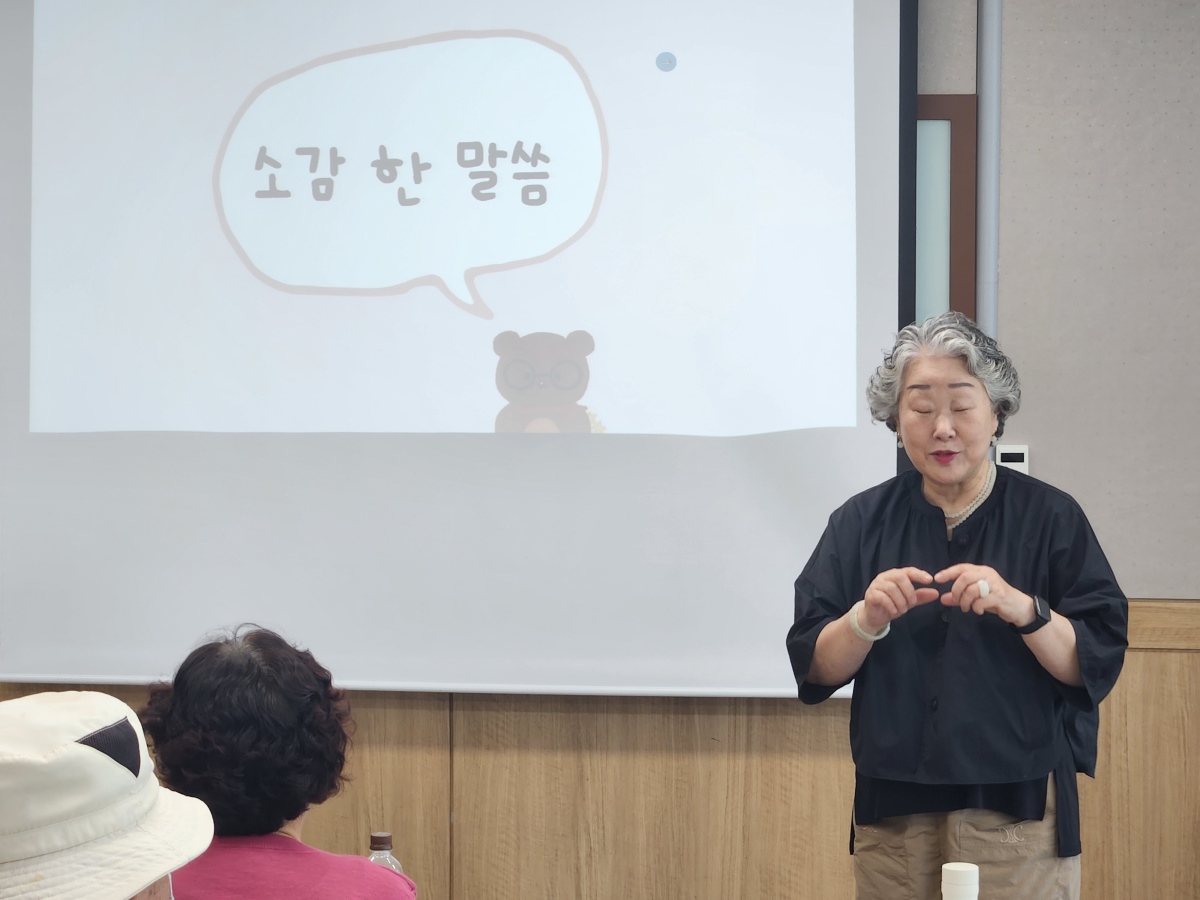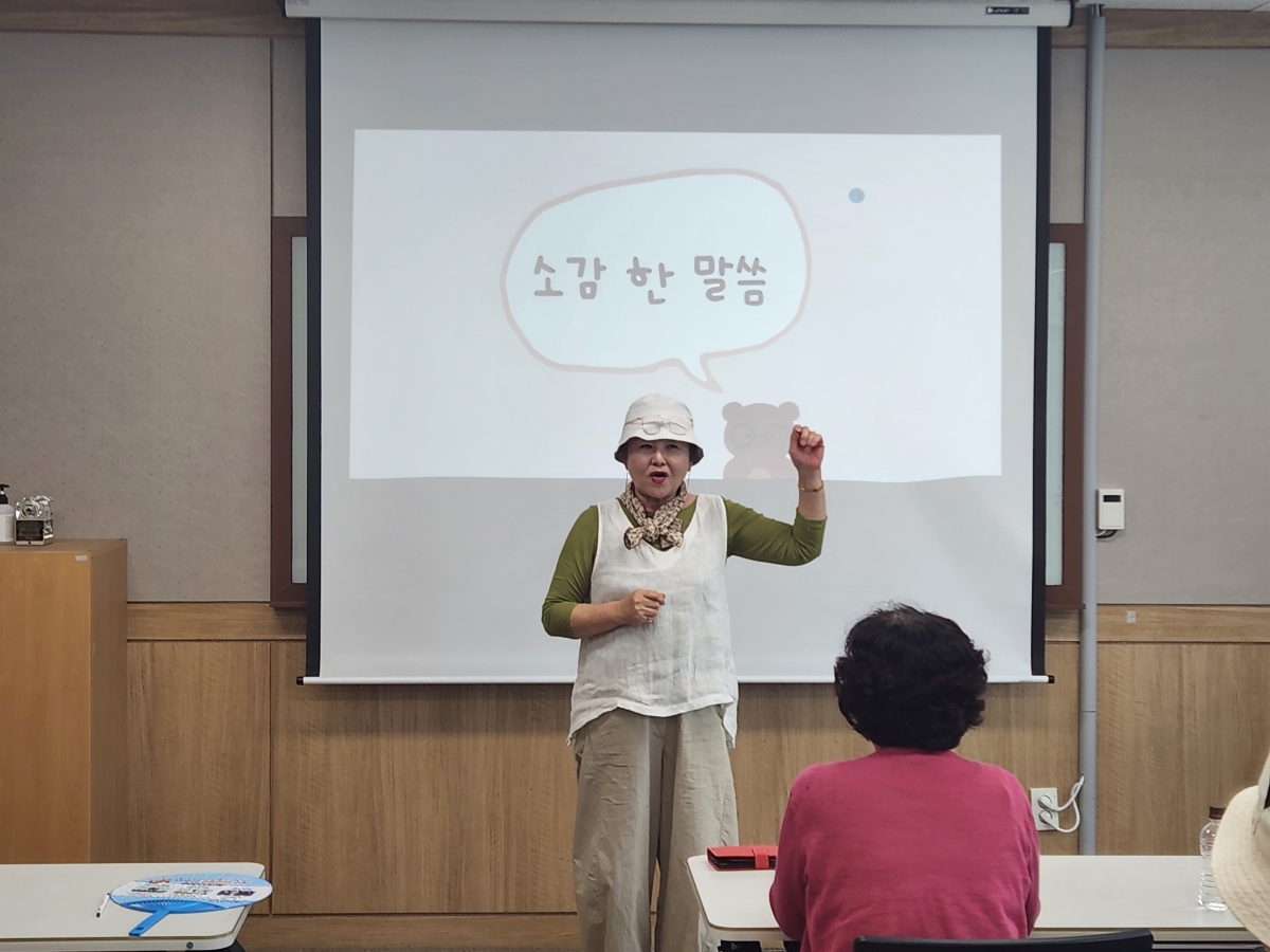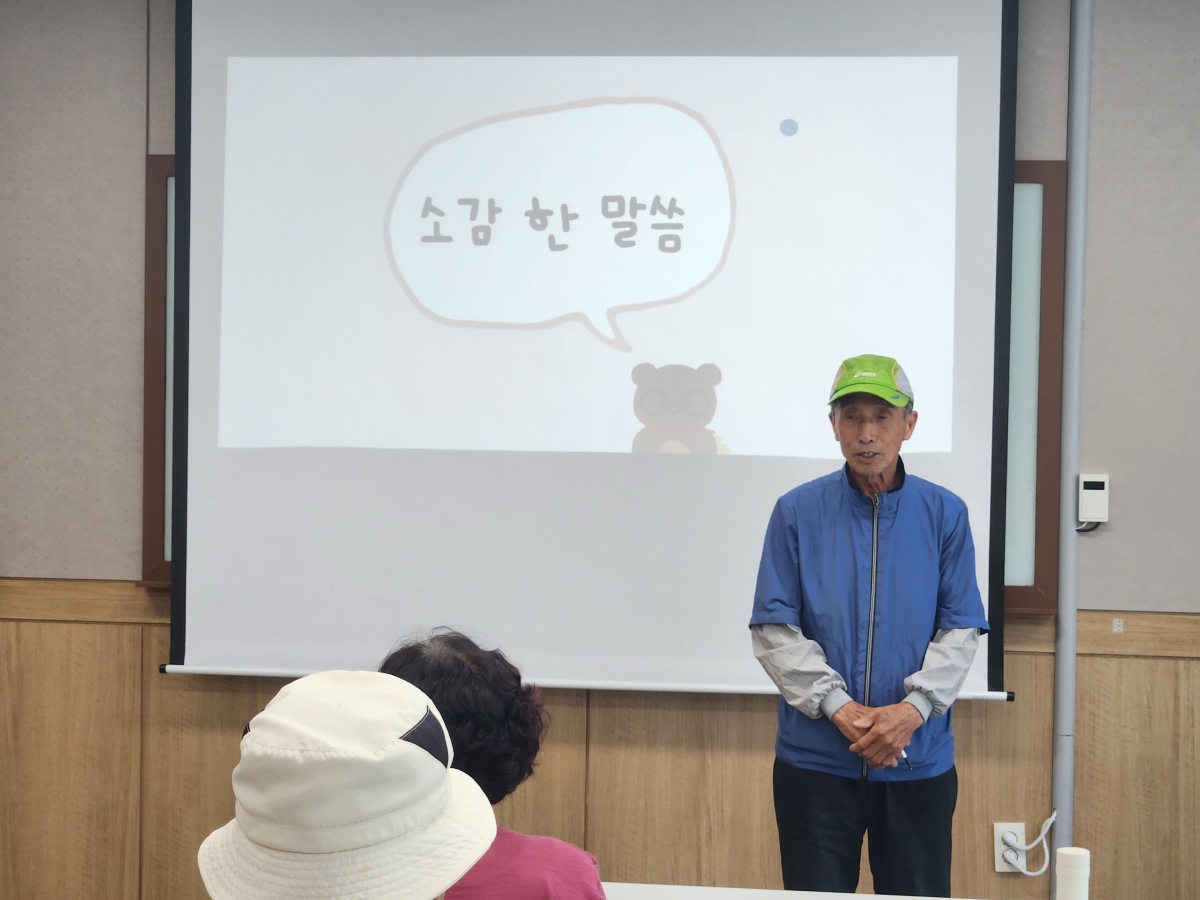 오늘은 [화기애애 희망지구]의 마지막 시간이라 다 같이 롤링페이퍼를 만들며 함께한 시간을 떠올리는 시간을 가졌습니다. 롤링페이퍼에 프로그램에 참여하며 느꼈던 점을 적어보고, 앞에서 소감을 발표하며 마무리하였습니다. [화기애애 희망지구] 덕분에 어르신들 모두 환경에 대한 소중함을 깨닫는 좋은 시간이 되었으며, 다음에는 더욱 즐거운 프로그램으로 찾아뵙겠습니다.